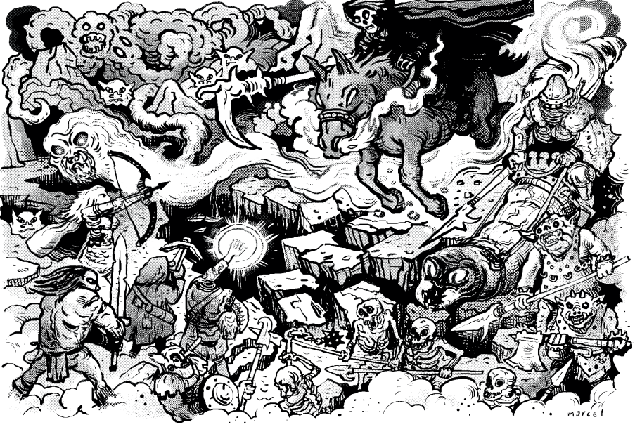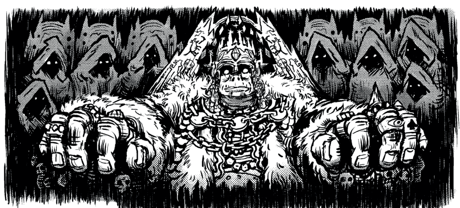 There’s a few exits that the PCs can take in order to escape the underworld. And they do feel distinct. One involves sneaking (or, if that fails, fighting) passed Cerebus. Another involves playing a Mesoamerican style ball game for your souls. Another involves simply choosing the correct “portal”. Succeed and the PCs are back in the land of the living! But it's left to the judge where and when they arrive. Is it moments after their death? Or years?
