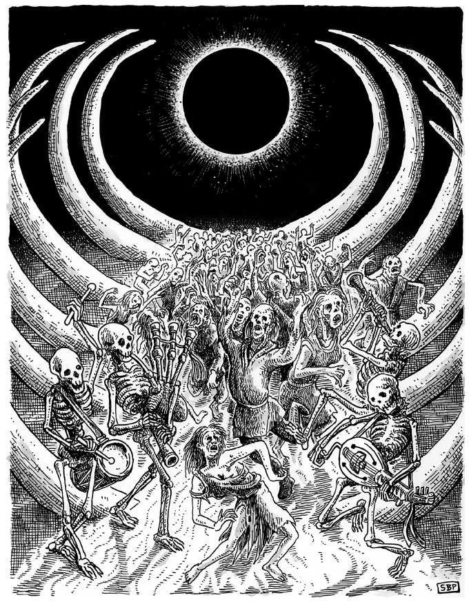 After the PCs pay Charon his fee (they do not want to start a fight with him), they arrive at a dance party! The dead frolic under the Black Sun, a powerful source of death magic. Not only that, the PC face danger from both the party goers who try to sap their energy so that the party keeps going. The Black Sun is possibly something that wizards can call upon after they return to the world of the living, but it carries great danger with it. Great stuff.