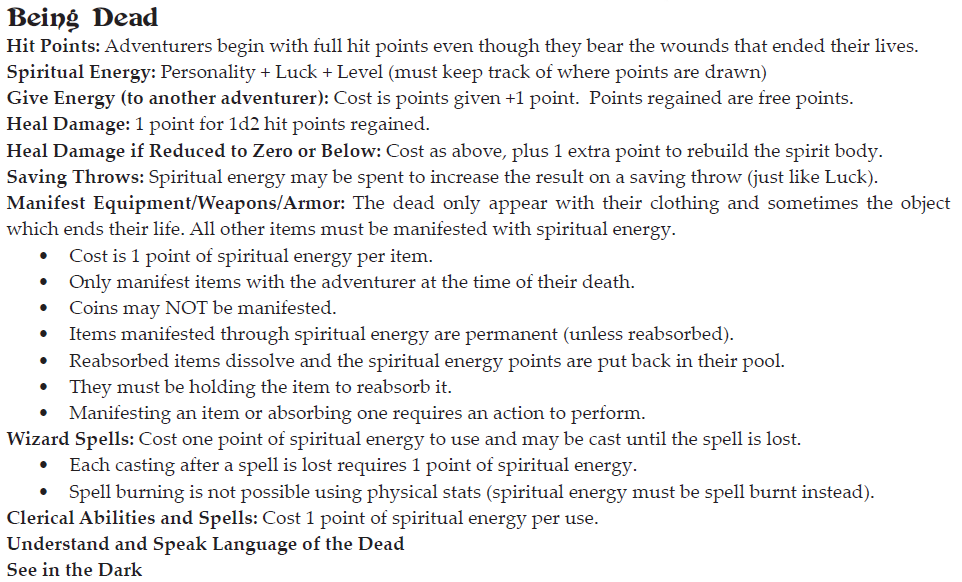 The adventure starts by providing some pretty cool rules for dead adventurers. There’s examples given for added clarity, but my players really dug these.