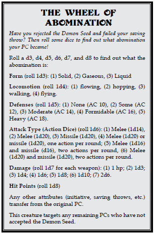 Finally we arrive in the cellar, several of the rooms still appear normal, but do have a creep factor. The PCs are likely wondering where their loved ones went! Even if they surmise that the bodies were used as compost or turned into abominations, they still lack the “why” factor. Area 3-4 has an otherworldly terror known as the Demon Seed, which has been anchored to this reality by Morto Blango, the current owner and distant relative of the necromancer Zatharides the Black. The Demon Seed now attempts to infect the PCs in a way described as “cosmic malware”. The PCs must make saves or listen to the command of the Demon Seed. And if it touches them, they must make saves or become infected.