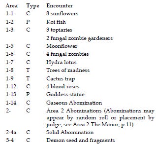 At the start of the adventure, we assume that the PCs have all come to find their missing loved ones and aren’t turning back until they haver an answer. They begin in the large “garden area” on the way to the manor. After fighting some monstrous sunflowers, the PCs will realize that there’s serious trouble here and they need to choose a path forward. There’s two different paths which each quickly split into two more different paths, and so forth. When I played in this adventure, we brief split the party into four separate groups, making the judge’s life rather difficult for a while.