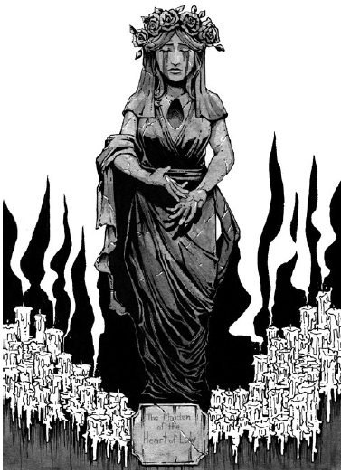 The area Beneath the Cairn is a very brief one that mostly serves as a the place where different paths meet. The PCs can journey to Gabbro's cave, the Inn, the Shrine of Set, and the Shrine of Mitra. The Shrine of Mitra is hazardous to any chaotically aligned PCs. They take 1d5 damage upon entering and 1 damage every 10 minutes thereafter. I'll note that this was much more lethal in playtests! And there’s still other hazards that would keep the agents of Set from sticking around. Fortunately for one of my players, I rolled low on my 1d20 damage and they survived long enough to get out. Mitra's Shrine has a couple potential combats, but clever PCs can get through without any fighting. Either way, the PCs are going to enjoy this place. There's the chance for one of them to have their teeth magically replaced with Mitra's Jaws of Law, which is a very powerful magic item. They can also ask the actual statue of the Weeping Maiden for a bless form Mitra. But with each blessing (received on a 1d5 table) comes a quest (a 1d3 table)!