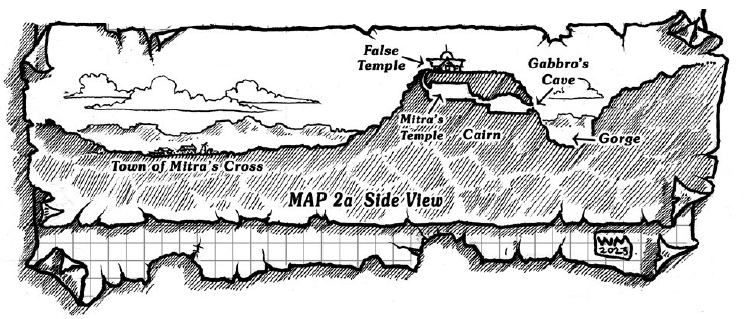 Things start off with a concise overview of Set and Mitra's conflict, as well as the more immediate conflict presented within the adventure. By the next page, we're already seeing a map of the local town (more of a trade post as it's just a few buildings), suggested adventure hooks, and area descriptions. There's 6 distinct locations within this adventure: the town of Mitra's Cross, the False Temple, the Gorge & Cavern, Beneath The Cairn, the True Shrine of Mitra, and the Shrine of Set.