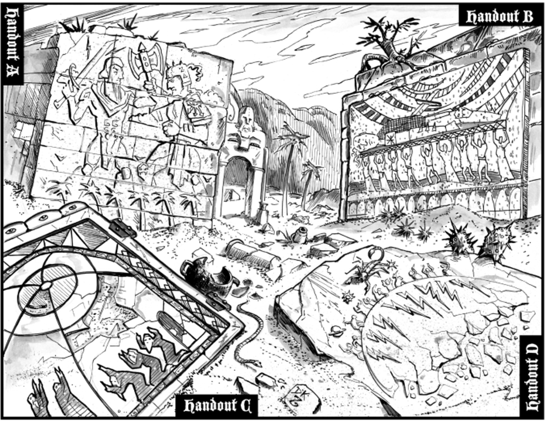 Before we get to the main portion of the review, I’ll take a moment to state that the illustrations and cartography is just as good as ever with Goodman Games products. We also have several great handouts. But we also have the same layout issues as ever. For example, page 11 (a right-side page) ends mid enemy stat-clock, then next page is an awesome full page piece, and then the stat block finishes on page 13. While that may be the most egregious example, its not the only one. But I will also say that not every page spread suffers from these layout sins.