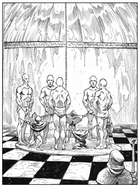 Area 2-8 holds the final encounter, and it is fortunately described upon a single page! The Handmaiden of Cadixtat (as a reminder, these are all giants) is performing a sacrificial ritual while a chaos champion defends her. If the Handmaiden slays all the martyrs, Cadixtat’s brain awakens from one of the massive canopic jars in this room and attempts to dominate a PC each round. This is a great way to arrange a combat for a finale. The combat essentially has an “A plot” (kill the bad guys) and a “B plot” (a ritual that makes things harder). Plus, the room has some environmental aspects to it with a pool in the center and the canopic jars in a raised area.