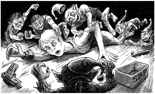 The second floor has much of the same general features, such as spooky holiday music and florescent lighting, but differs greatly in its contents. It contains Khadro the Snow-man, a mutant who is eternally surrounded by a 10’ radius snow storm. The adventure mentions that he preys on the feral elves for food, but I wish a little more was given to him for roleplaying purposes. Still he can be a very interesting character for the PCs to meet. We also have the Toymaker, who’s a strange robot who turns feral elves into grotesque nutcrackers, aka the “wood-gods”. There’s more threats to detail, but all-in-all this level has a few too many monsters to fight, in my own opinion. The lethality level is somewhat balanced by the presence of the “Immortalizer”, a strange artifact that can bring a recently deceased corpse back to life.