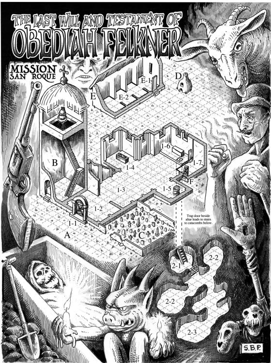 For some reason, the PCs have been named as the beneficiaries of the recently deceased Obediah Felkner. However, they receive the claim to his silver mine only if they can bring back a holy relic known as the Hand of San Roque and deliver it to Obediah’s widow before dawn. Oh, and by the way, Obediah died of a deadly disease that quickly killed him and you all have the same symptoms as he did. And the holy relic can also be used to cure you. So hop to it!