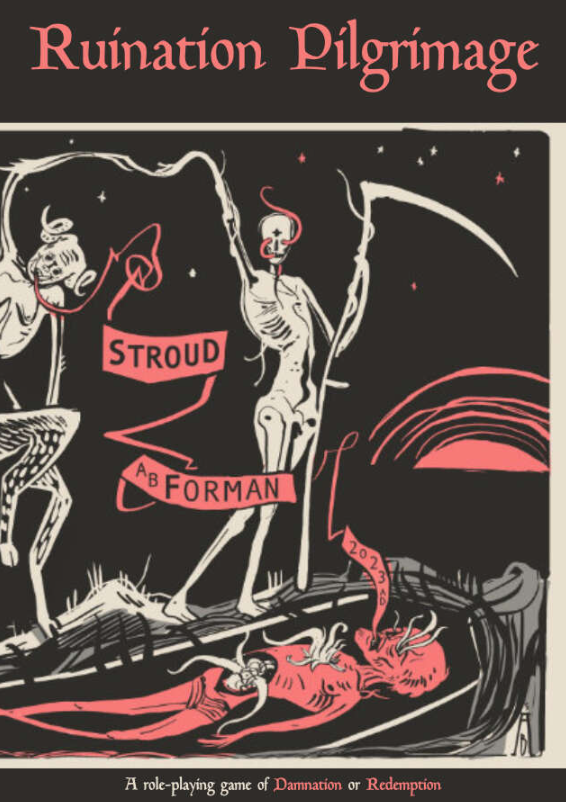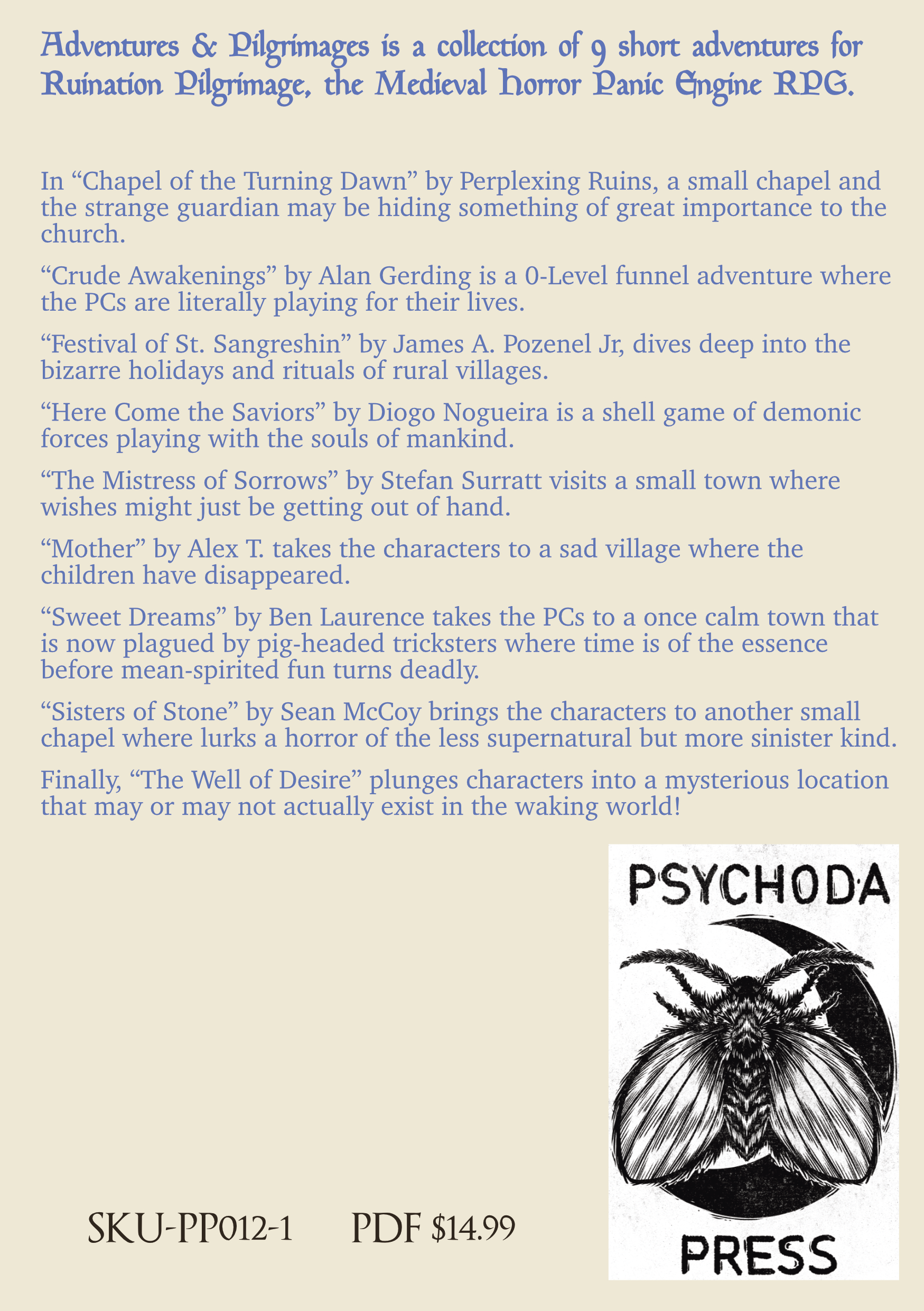 Ruination Pilgrimage is a Panic Engine Game (aka, it uses the Mothership system as a basis) of horror, plague, warfare, and demons set in a medieval age. The book contains the rules, setting info, and numerous tables to help game masters run their games. Tonally, the game owes a lot of inspiration to Between Two Fires. It’s an excellent book that had been on my radar before Donn asked me to write an adventure, but that request is what got me to dive into it. I actually listened to the audiobook and can promise that its excellent!