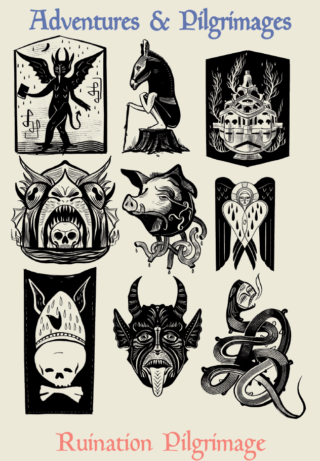 Ruination Pilgrimage is out! And so is the Bestiary and so is the book of Adventures & Pilgrimages! Why do I, one who usually just talks about DCC, bring this up? Well, one part is because Donn Stroud wrote this and he’s created one brilliant DCC material before, my favorite of which is The Lesser Key of the Celestial Legion. If you pair that with his The Forgotten Rites of the Moldering Dead, you can see the DNA forming for what would become Ruination Pilgrimage. The other part is simply because I wrote one of the adventures in the Adventures & Pilgrimages book. That adventure is titled The Mistress of Sorrow. Just like with children, it can be hard to pick the favorite adventure that I’ve written, but I think this may be one of my best. So let’s talk about what exactly Ruination Pilgrimage is and a bit about my little adventure.