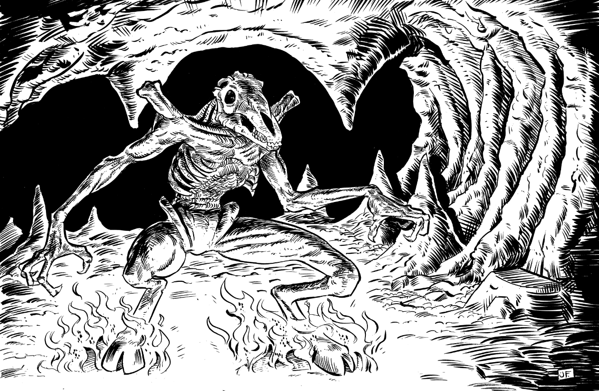 The idea started with having miners who because deformed degenerates after finding a giant egg with a gestating skinwalker in a natural cavern. The silver mine had run dry, but the desperate few who stayed were forever changed by the psychic energy of the dark creature. But that’s just the core idea, not an adventure. How did I start writing it? I looked at one of my favorite adventures, Sailors on the Starless Sea.