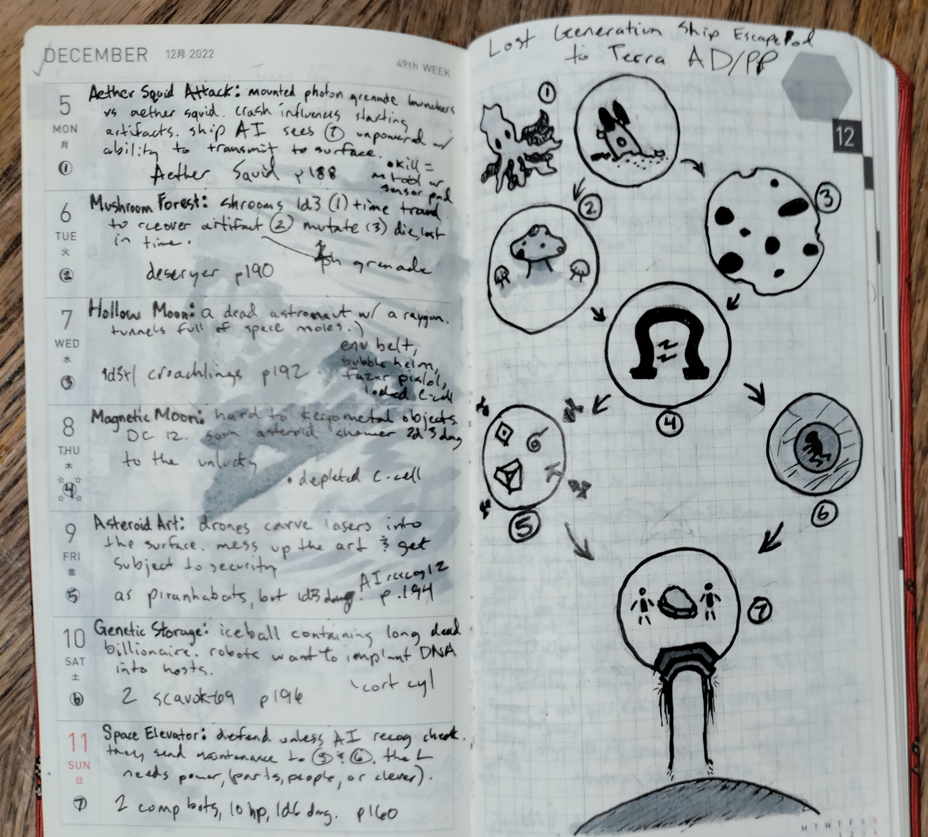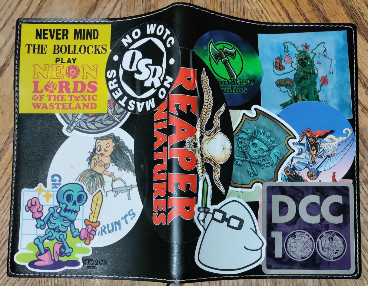 So if you did #dungeon23 then don’t let your efforts and writing collect dust! Join me in #tuneup24. Playtest, revise, expand, and maybe even publish! I will continue to write in a physical notebook, but won’t be doing it everyday. The physical act really helps me get out ideas and its good to get away from screens. Plus, I can cover it in stickers! If you see me at a convention, give me a sticker to add to my notebook jacket!
