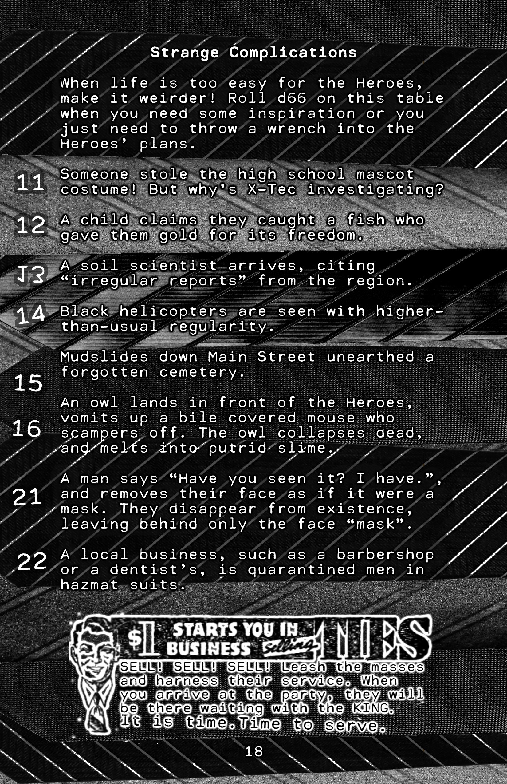 So I’ve mentioned Weird Heroes of Public Access in my Favorite Zines of 2023 post, and I’m still loving it. I keep thinking about how perfect the vibes are. I started making my own supplemental zine out of pure love and how inspiring the core material felt. I first wrote an adventure, originally titled The Red Truth of Fellowship Farm, but it later became The Yellow Truth of Fellowship Farm. This adventure has everything: drugs, murder, possession, prophetic comic books, cultists, and teen pregnancy!