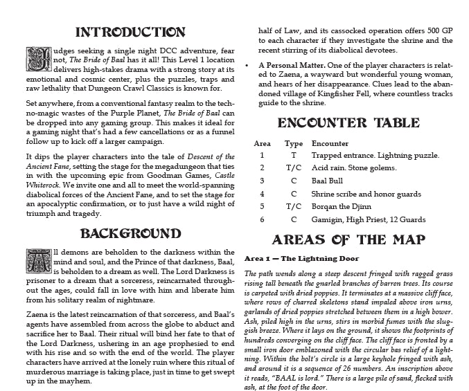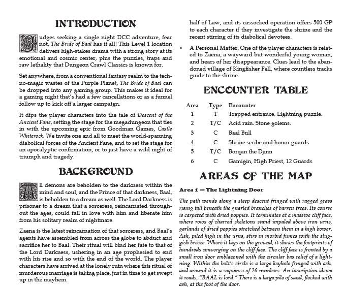 Bride of Baal came about because I recognized a need for a one-night adventure that still tells a thrilling tale of high stakes, tied to the overarching narrative of Descent of the Ancient Fane. So often as a judge, I’m faced with game night cancellations and have to choose whether to skip a night so that everyone can participate in the ongoing campaign, or have the cancelling players miss out. I created Bride of Baal to be played in a single night, with only four PCs, though it’s certainly lethal enough to challenge a larger party. It takes place in a generic fantasy setting, so can fit any DCC game group. And as I note, it puts the players into the heart of the narrative in Descent of the Ancient Fane, as a prequel featuring a major NPC and a world-changing event in that story. In Bride of Baal, the players stumble into the end boss again, as Baal seeks to claim a sorceress who is integral to his diabolical plans. I’ve found it to be compelling for the PCs who survive it, inspiring them to want to thwart the dark forces that nearly claimed their lives in the tragic ceremony that takes place in it.