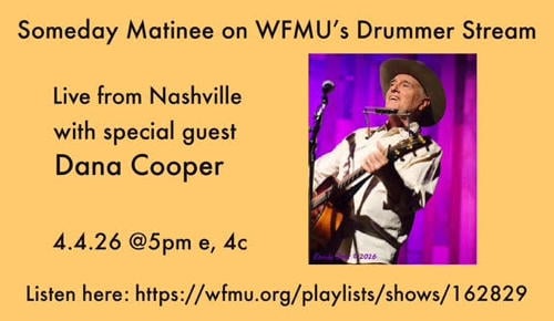Dana Cooper is a good friend to Someday Matinee, and he’s coming back to play some songs and tell us about life on the road, and his upcoming Nashville residency. We’ll be surrounded by boxes, mid-move into the new Studio G!