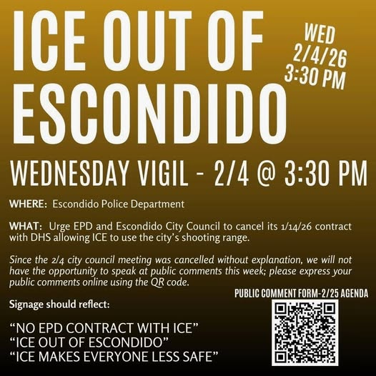 Join this vigil on Wednesday, Feb 4 at 3:30 at the Police Station at 1163 N Center City Pkwy, Escondido