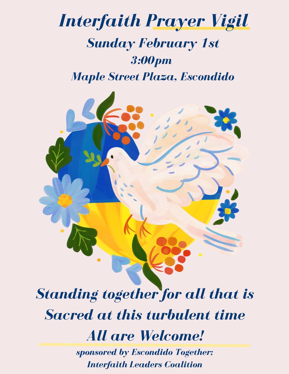 Please attend if you can. Led by Escondido Together Interfaith Leaders Coalition. Standing Together for all that is Sacred in these turbulent times. Bring your quiet energy and open hearts.