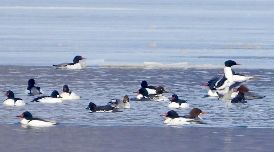 Most of these are mixed flocks of Common Mergansers, one of our largest duck species, and Common Goldeneyes. They breed in Canada and Alaska, then fly south for the winter, mostly to large freshwater rivers and lakes in the United States, like the Mississippi and Lake Pepin. Some, especially Goldeneyes, also winter off the Pacific and Atlantic coasts.
