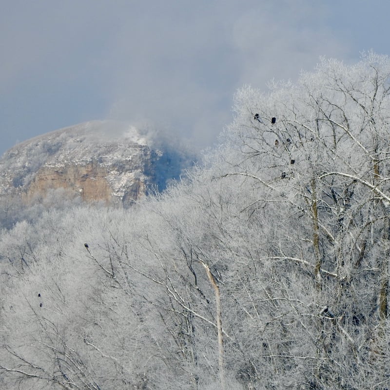 Bald Eagles love it here, where open and relatively clean fresh water, thick with fish, can be found year round. We see them all the time, sometimes by the dozens, dotting the river shoreline, chilling on the edge of the ice, or feeding roadside on an unlucky deer. It’s thrilling to see a pair of Baldies wheel over the water in their tandem courtship dance, spinning together with talons joined, their white heads and tails flashing in the sun.
