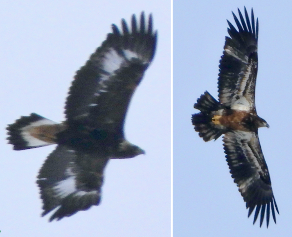 Well, the thing that makes this ID tricky is that Bald Eagles take a full five years to get their white heads and tails. In the meantime, the immature birds are basically dark all over, with some smudgy white blotches here and there. And young Golden Eagles, soaring in the sky, look basically dark all over with some white blotches too. So what’s a bird watcher to think?