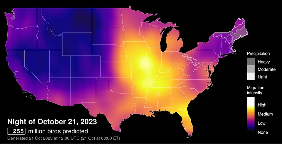You can easily access BirdCast, a free website, for cool migration information. First, check their Bird Migration Forecast Maps. These will wow you with how many birds are predicted to be migrating across the United States on any given night. For example, the prediction for October 21, when I was writing this essay, was that 255 MILLION birds would be migrating, most of them along the Mississippi River flyway.