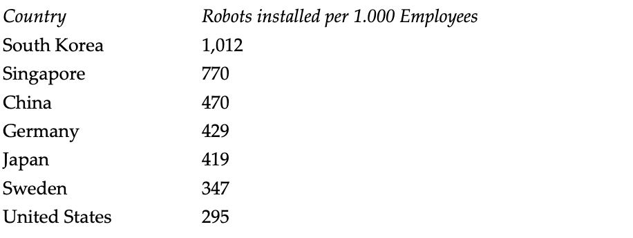 Thirdly, it is crucial to understand the uneven development of China’s economy.37 Its central and western provinces are much less economically developed. On the other hand, if one takes key industries into account, China is competitive with its Western rivals. The current global arms race in AI development, 5G, chip production, and other high-tech industries shows this very clearly. This becomes more evident when considering China’s strong position in industrial robots. Today, it alone possesses 31 percent of all industrial robots; China’s number of robots installed per employees in manufacturing is higher than that of Germany, Japan, or the United States.38 (See Table 8)