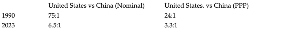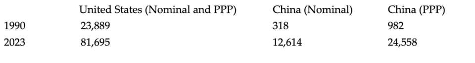 Table 6. United States and China GDP Per Capita in 1990 and 2023 (in Nominal and PPP US-Dollar)34