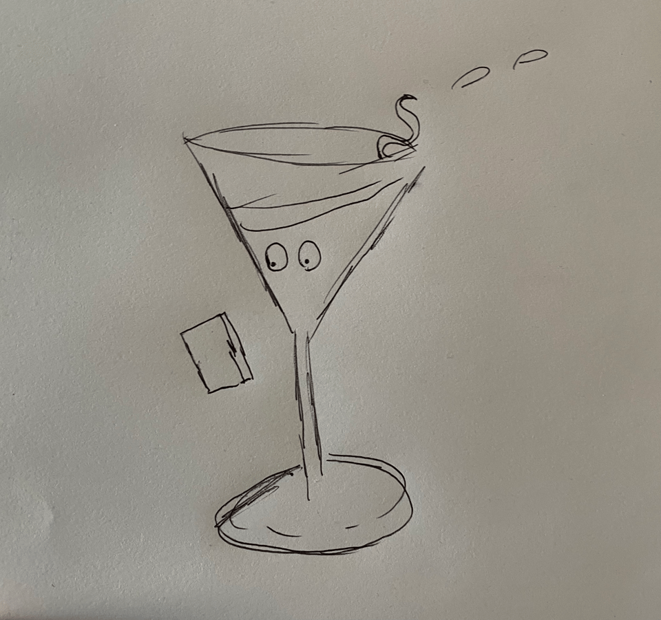 A sketch inspired by my week. A Vesper martini checks its phone for updates. The martini does not have hands. Let's keep this somewhat realistic. My best to you on your adventures in concentration! Will I make my reasonable? Will you make yours? Let's find out together in the FUTURE LAND known as next Tuesday!