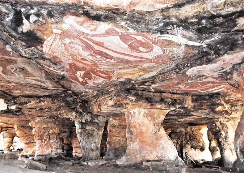 There are large paintings of barramundi and other fish, wallabies, lizards, snakes, even what must be a more recent one of a horse, a bird, perhaps a cockatoo, she always believes, a turtle, people wearing their traditional dresses, or nude, and even the elongated white mimi spirits, some symbols and negative hands. The hands of their ancestors will embrace them under the low ceiling.