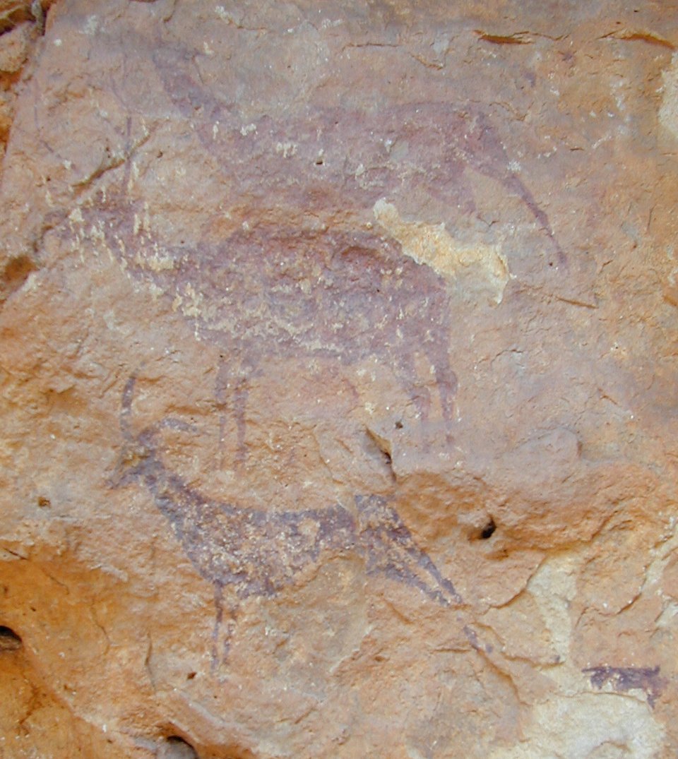 The site is also special for the hunting scenes, some very close to the honey-gathering spectacle. These mainly show hunters armed with bows after some goats, but also a few deer. Both are represented in the photo above.