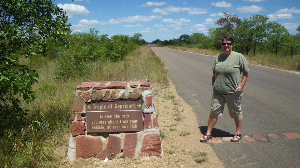 Another memorable photo op is with the Tropic of Capricorn sign in Kruger National Park in South Africa. It’s right next to the road in a park where you’re supposed to stay in the car lest you get eaten by a leopard. My visit was a hasty one, but I needed to get a photo.