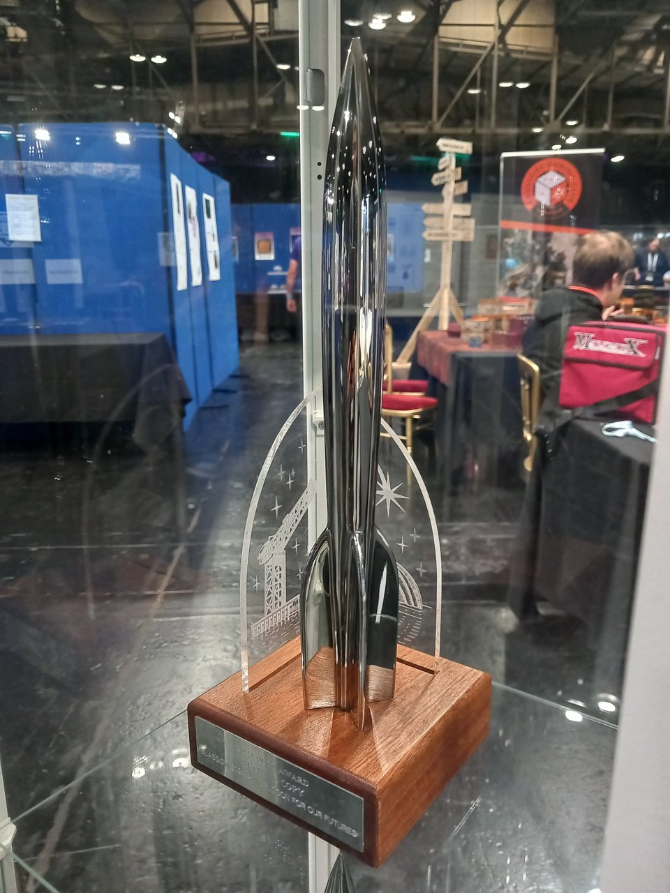 I won’t go day by day, though. The main halls of the convention were great, filled with exhibitions, stalls from organisations as well as the whole hall of retailers, a freebies library, some Batmobiles. And the photo below is from a history of the Hugo Awards display, this year’s award design with iconic images of Glasgow on the base.