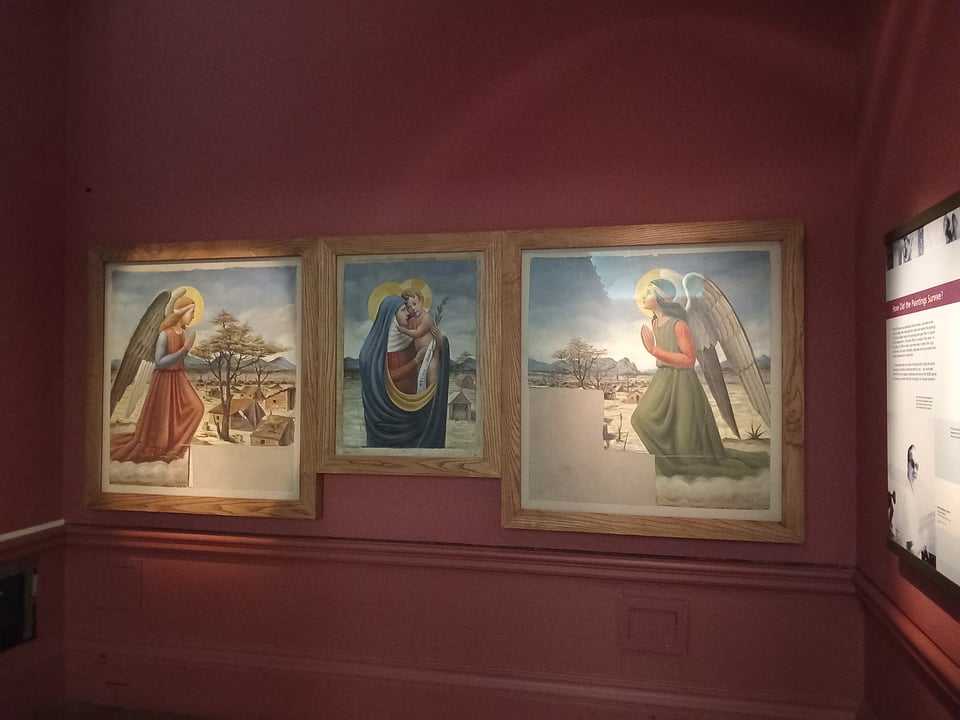 These three scenes, painted on flower bags, were made by an Italian POW in the camp of Lafaruk in North Africa, displayed in a small chapel there. They were given as a gift to the British commander in charge of the camp, known for treating prisoners well, once the war was over.