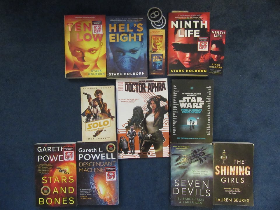 Those are all the books I took to get signed at Wolrdcon. You can see the swag related to Stark Holborn’s trilogy, some Star Wars stuff signed by Mur Lafferty or Kieron Gillen or both in the case of the anthology on the right, plus Kelly Sue DeConnick. Then there’s Gareth’s duology and books by L.R. Lam and Lauren Beukes. So that’s ten books that I took with me. That amount doubled for the trip back!
