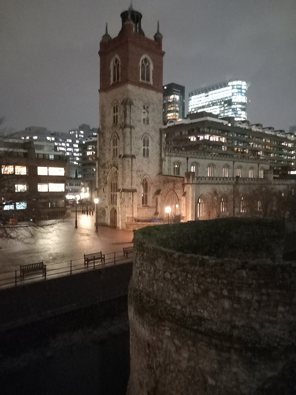 The walk continued past all the intact sections of Roman then mediaeval walls, in a variety of locations by a viewing platform of the Tower of London, in a hotel/restaurant courtyard, several parks, within the basement of a building. My favourite section was walking the high walk around the Barbican. It would make a great location for a thriller, with the long featureless walkways, following the line of the water, ancient Roman fort wall and tower, and with the illuminated church.