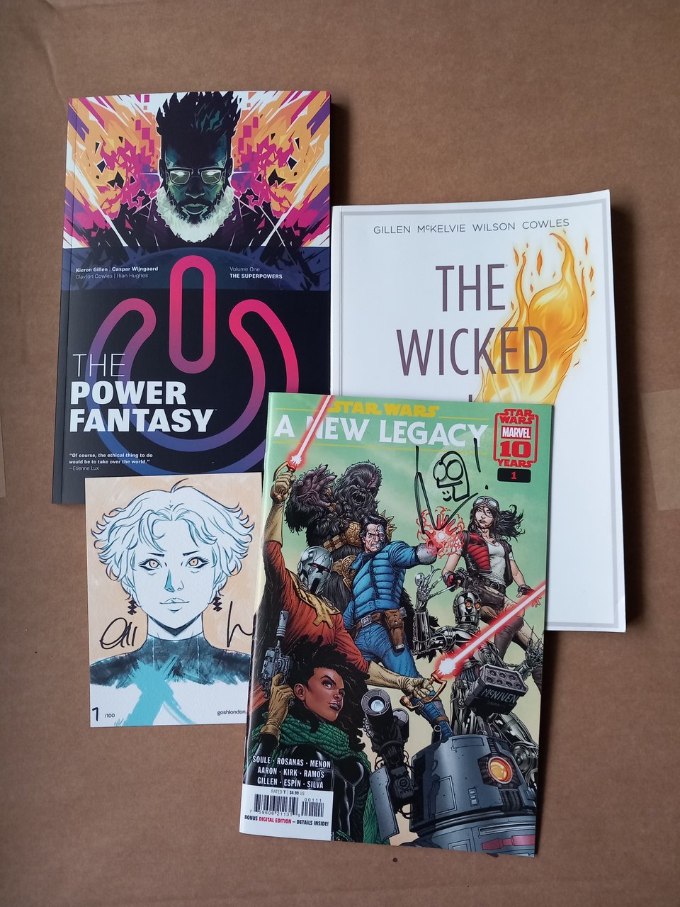 The haul from the Gosh! signing, with the 1/100 signed bookplate! Plus I’d picked up earlier the first volume of The Wicked and the Divine and A New Legacy, a fantastic collection of three short stories celebrating ten years of the new Marvel Star Wars comics. There’s one from Charles Soule, a great return of the Empire’s SCAR Squadron from Jason Aaron and a story for the first time featuring all of the characters Kieron introduced (which Paul Cornell wrote about in December!) together in a free moment in the tight timeline of twenty-five Vader comics Kieron wrote. The comic marks ten years of my properly reading and collecting the medium. Hopefully I’ll get it signed by the other two influential writers someday.