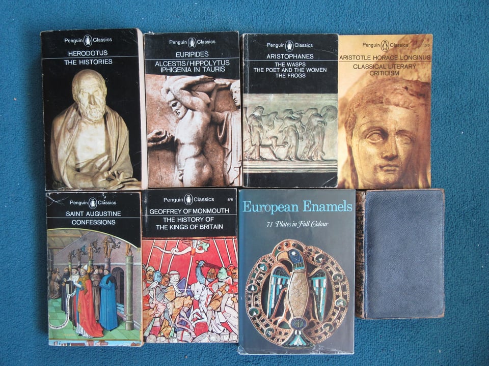 The final lot. These are all from some small bookshop in Oxfordshire that my parents visited. I think I’ll enjoy reading some actual (translated) historical texts. The enamel one may have some interesting artefacts and that last one is an old book about Rome, in poetry.