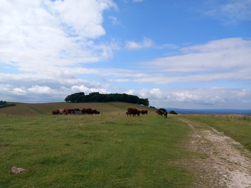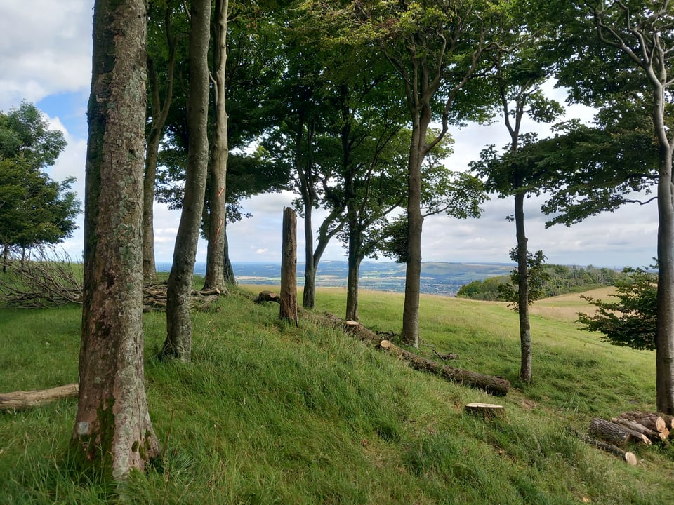 On the way back we popped up the South Downs to see Chanctonbury Ring, a site that’s been in use since the Neolithic, was a Bronze Age henge, maybe a hillfort and then the site of two Roman temples. The main thing to see is the view the ancient people selected really, a site probably off their trackway. All the trees were planted much more recently. We perhaps found where the Roman temple was, a flatter part in the middle of the ring with lots of shards of red clay tile.