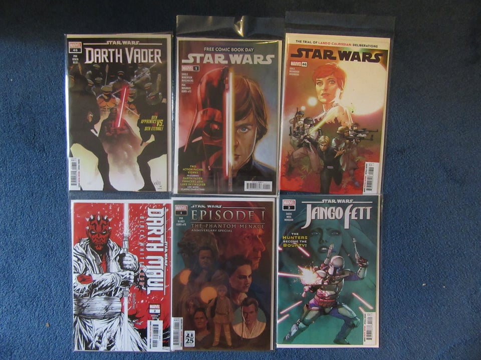 There was another great delivery of Star Wars comics, with many series continuing but also two special comics on the middle. A Place in Space, the business that I get my comics from, managed to send the May 4th Free Comic Bok Day special issue Star Wars/Darth Vader issue in the middle top row. Then there’s the exciting Phantom Menace special, with short tales celebrating 25 years of that film.