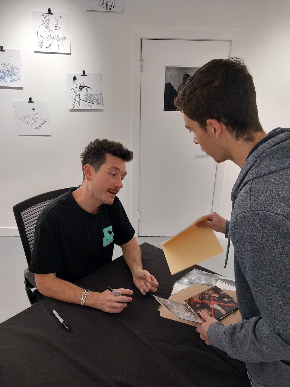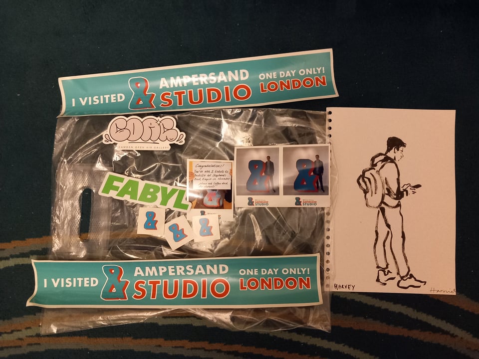 Behind him at that desk are original prints from artist Harriet Bruce, who produced incredible pieces for each song on the album, featured in lyric videos, on the podcast and within the CD and vinyls. It said on the ad that she’d be there doing live illustrations throughout the day. On my second trip in, I caught her just warming up with a sketch of someone, but throughout the day she used more inks. Anyway, she was lovely to talk to and I said I’d come back later. Flash forward to when I was frantically looking on my phone when I won the concert tickets, and I turned to talk to the people at the coffee desk when I heard my name. It was Harriet, telling me to stay where I was. Then a minute or so later, she handed me the brilliant portrait below, pictured beside all my goodies from the day.