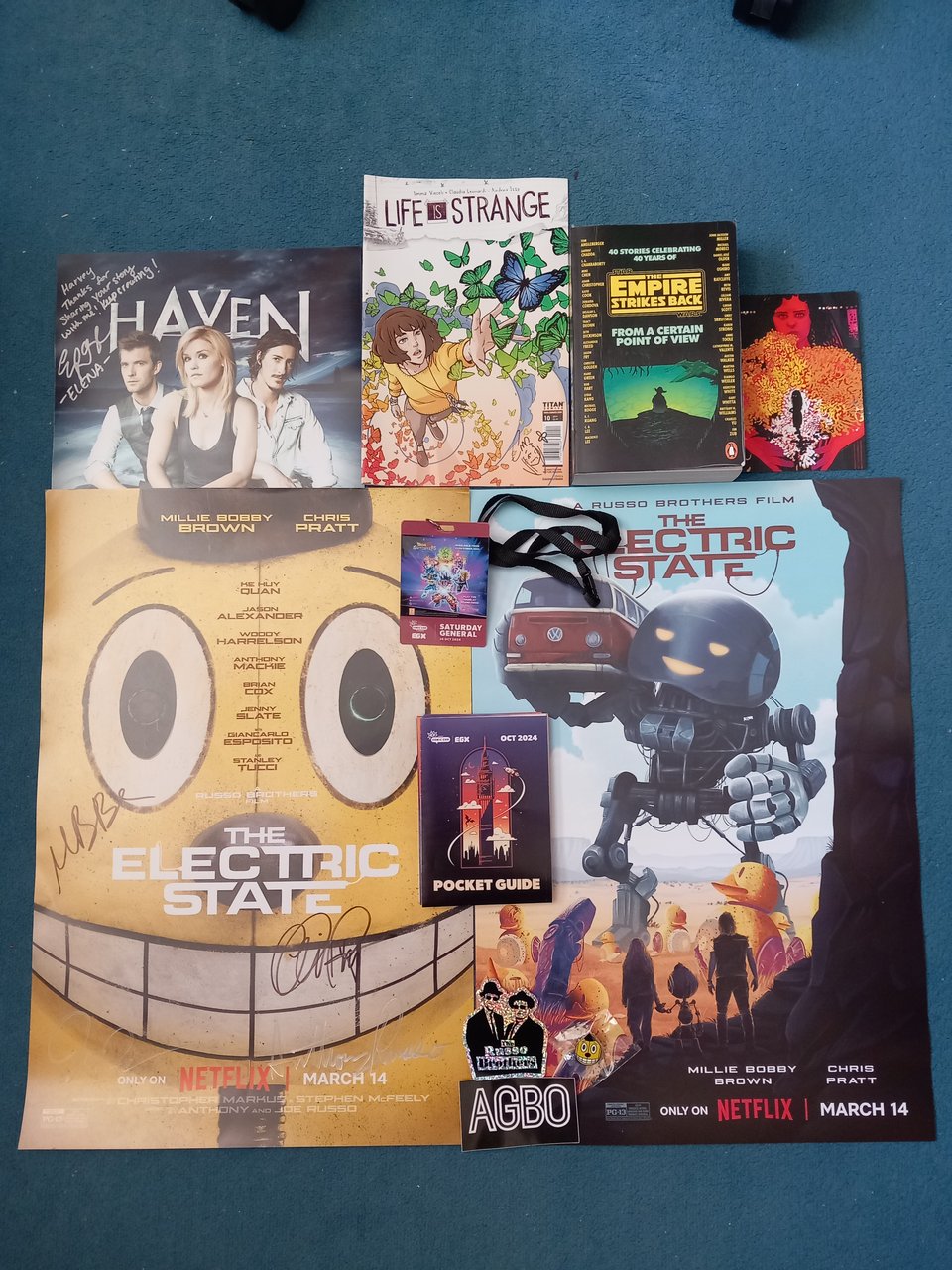 The film’s based on Simon Stalenhag’s book of the same name. I’ve liked the Swedish artist’s retro-sci-fi works for years, even based one of my final GCSE art pieces on his work, so being amongst some of the first in the world to see it brought to life in animatronics and on the big screen was pretty special. But then there's all the goodies. I was lucky enough to see the instagram post from AGBO films and Doaly, and meet some members of the crew, receiving the con-exclusive poster, a pin, some classy stickers, and the regular poster signed by the directors and the film’s two leads!