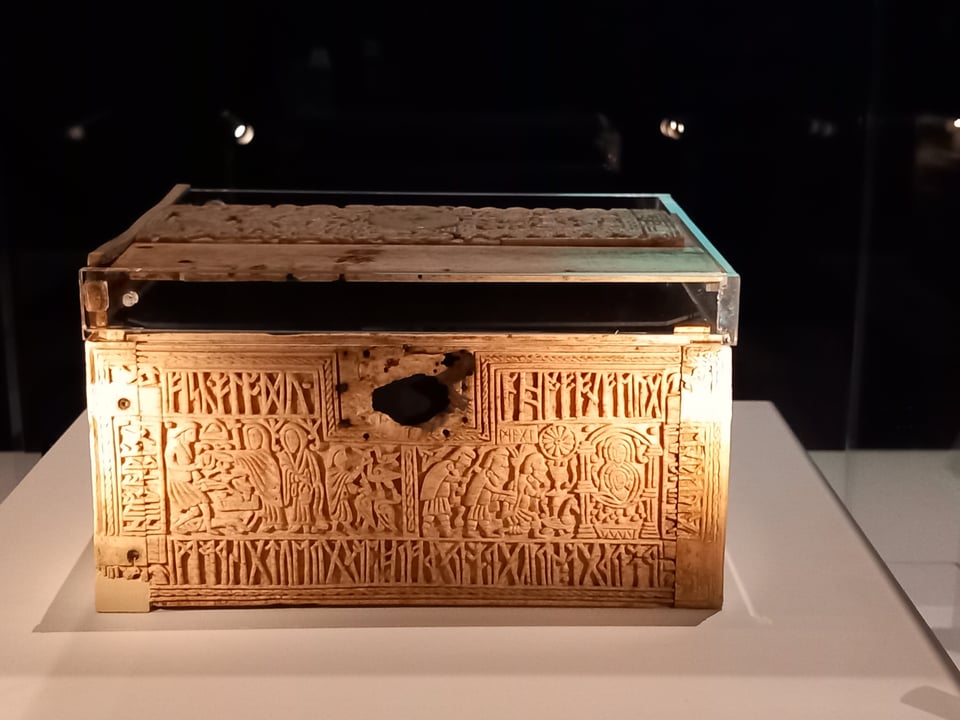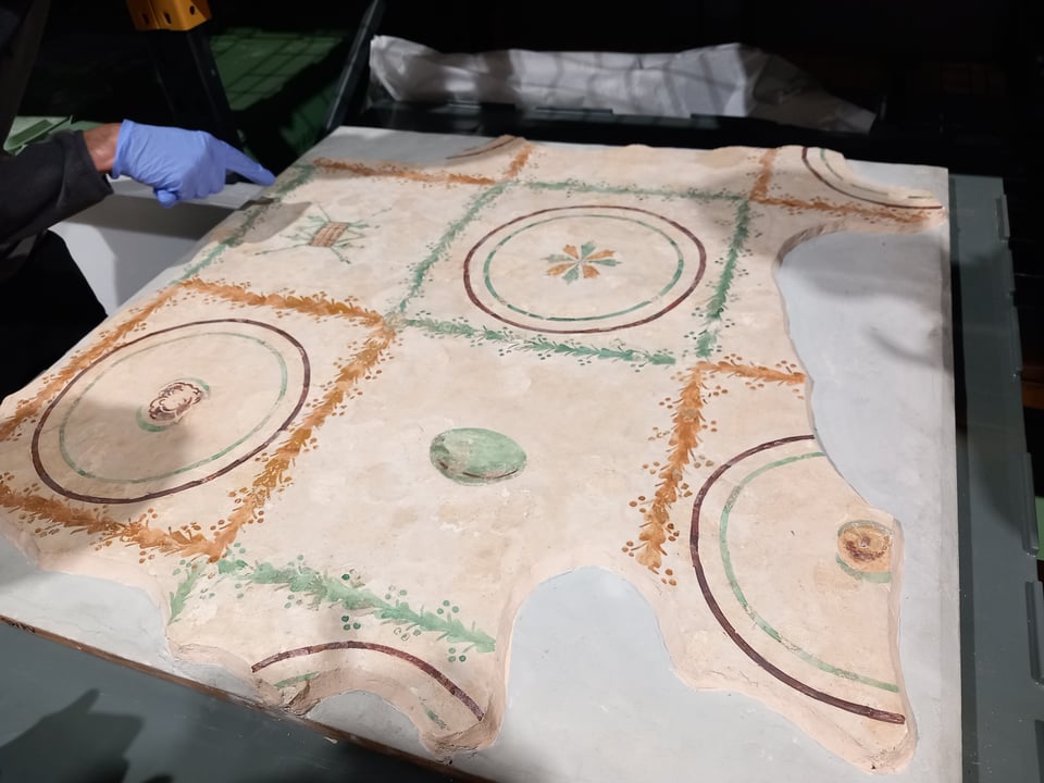 They had so many more finds from the site than I knew existed, like a bone comb, some painted pottery, a very nice intact coin. The amount of finds was amazing, and Ian also showed us some star finds from another nearby villa, like a super well-preserved swiss-army-knife-like bath set, and this reconstructed piece of wall plaster, matching exactly the decorations mentioned in the 1816 excavations at North Leigh!
