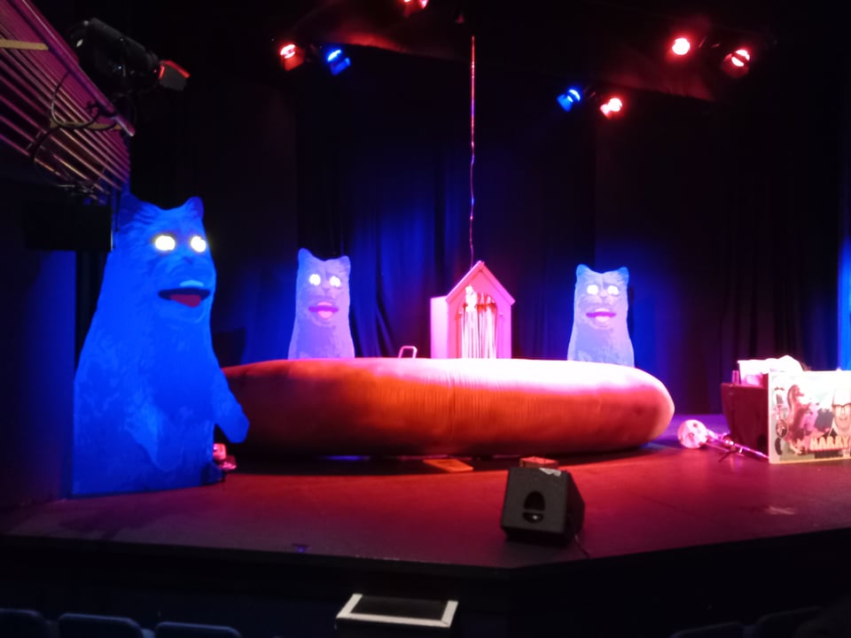 To extremely different glowing orbs, here’s the aftermath of a Harry Hill performance, with bright-eyed Stouffer the cats. Yes, that is a giant sausage.
