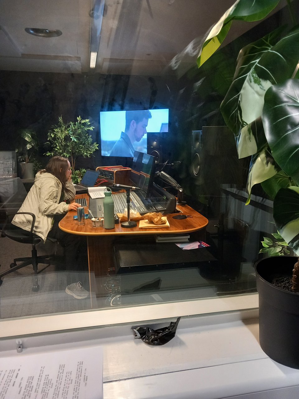 The next day, I was in Greenwich to record ADR for Pulling Strings. I didn’t know what to expect, but was led to this amazing booth with a lot of equipment, and this view into the main studio, with film playing, speakers and you can see all the sliders there. I had headphones on to hear anything, and a proper mic to act into. Fun!