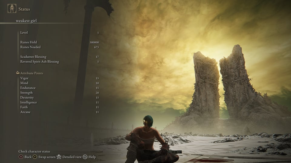 What I found compelling about this challenge was how it functioned as an expression of all my understanding of this beautiful and hostile world, a world that unlike our own, could be understood and prepared for even in the constraints of a challenge run. While my rights as a trans woman are under an impressively varied range of attacks that I feel wholly unequipped to brace against (what is one piece of paper that says “F” vs the “nuh-uh” approach being taken by the current administration), in Elden Ring I can grind out a Stone Club from the enemies that wield it and then bonk half the bosses in the game to death with it through a lot of kneecap breaking.