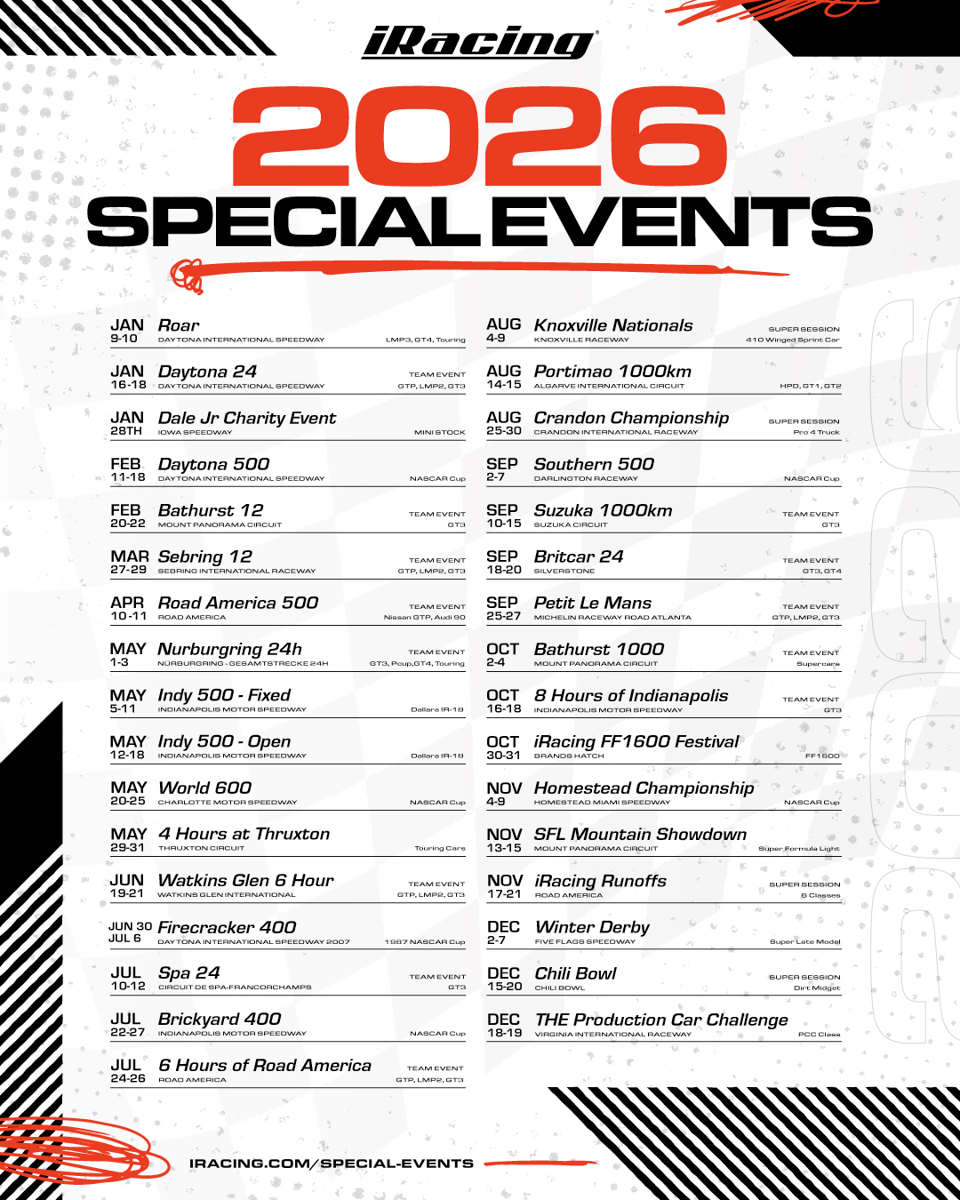 Meanwhile Gran Turismo has 2 million monthly active drivers, a stat no doubt boosted so high by the recent release of the Spec III update. For comparison iRacing had just under 500 thousand drivers across the whole year.iRacing special events schedule for 2026.