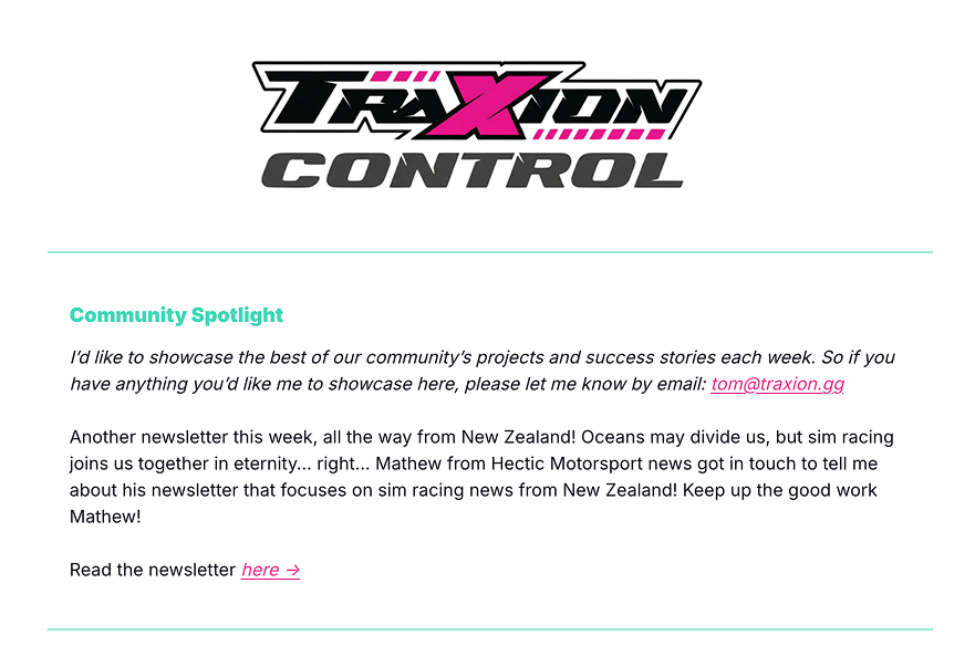 Hectic shoutout in Traxion Newsletter. Thanks to Tom and Traxion for sharing Hectic News on their newsletter, Traxion Control. If youβre not already subscribed over there itβs definitely worth checking it out for all the latest updates in racing games.