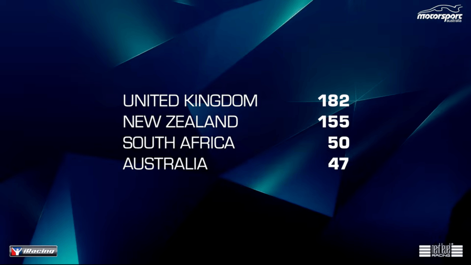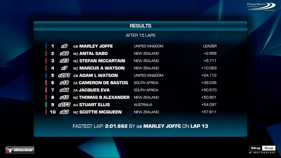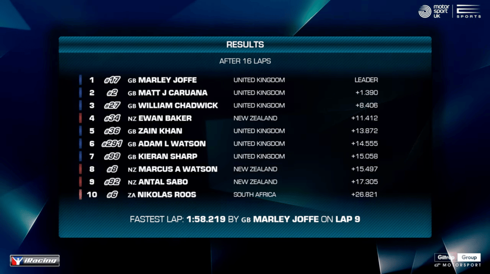 NZ finish 2nd in Four Nations Esports Series. If nothing else it’s worth watching “the big one” at T1 race 1. Lots of drivers taken out, including Ewan Baker, that shook up the order and ultimately setup up Antal Sabo to go on and finish as top kiwi, taking home a NLR HF8 Pro Haptic Feedback Pad. Well done also to Marcus A Watson and Stefan McCartain with great race results.