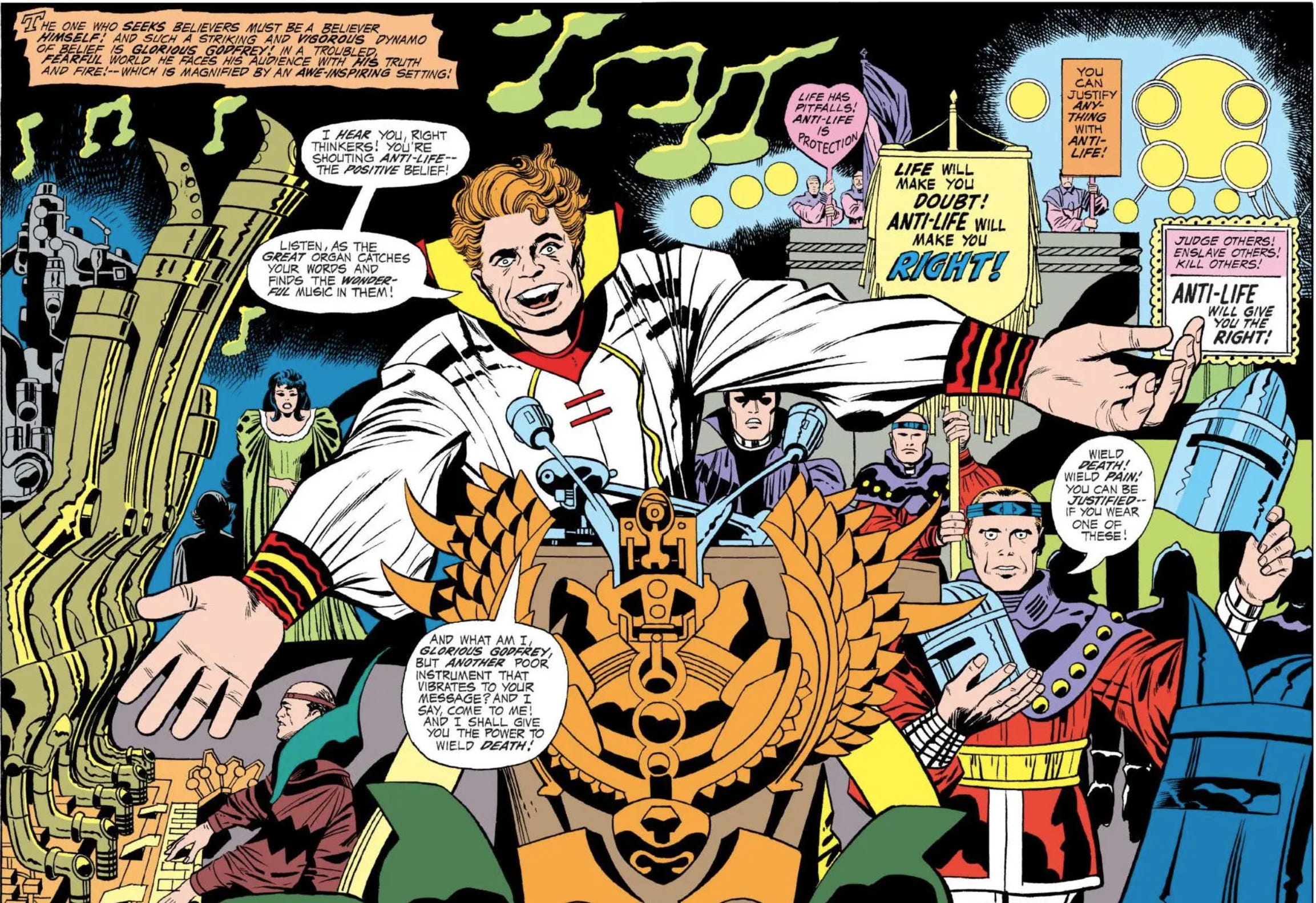 Over, a double-page splash shows us a vast stage, where Godfrey himself - ginger-haired, arms out-stretched, a gormless, open-mouthed grin spread across his slappable face – is preaching to the amassed audience on the wonders of ‘Anti-Life’. Behind him, a great organ plays ‘wonderful music’ - Presumably, YMCA by Village People.