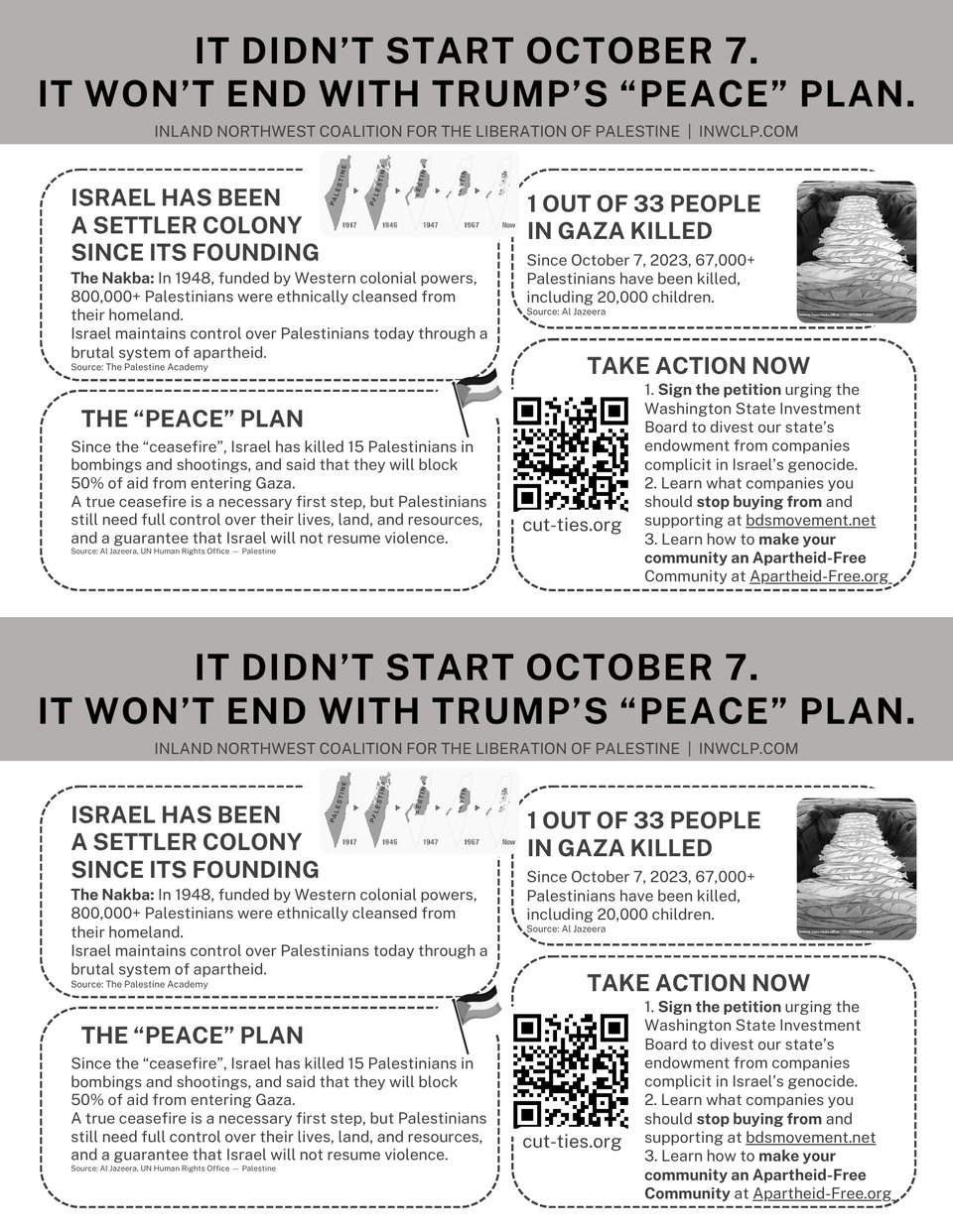 You are invited to bring flags and Palestine-related signs, or feel free to make copies of our ½-sheet educational flyer and pass them out.