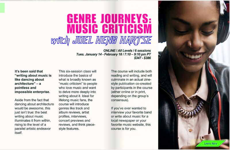 - This is something I’m really excited about: In January/February, I am teaching a class on writing about music for Hugo House, a literary nonprofit based in Seattle, but the class is online so anybody in the world can take it! Please let people know about this, or sign up yourself! I’ve wanted to teach a class like this forever.